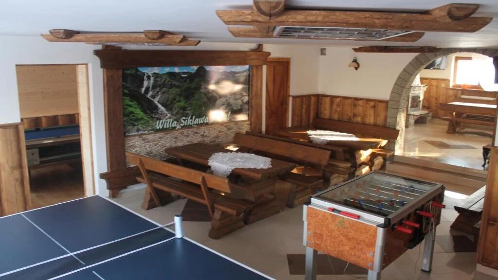 - w drugim budynku w odległości zaledwie 20 metrów: stołówka oraz sala z kominkiem, bilardem, stołem do ping-ponga oraz piłkarzykami - idealne miejsce do relaksu i integracji po dniu pełnym aktywności na stoku